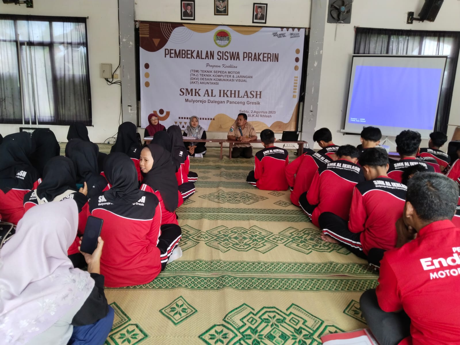 Kepala SMK Al Ikhlash, Mochamad Eka Akbar, S.Pd.I., S.Kom. sedang memberikan arahan kepada peserta prakerin./humas yppalikhlash.com – Sebanyak 60 siswa SMK Al Ikhlash siap diterjunkan dalam kegiatan Praktik Kerja Industri (Prakerin) yang akan berlangsung selama empat bulan, mulai 5 Agustus hingga 5 Desember 2025. Para siswa akan disebar ke 26 Dunia Usaha dan Dunia Industri (DUDI) yang tersebar di Kabupaten Gresik, Lamongan, dan Tuban. Mitra DUDI yang terlibat meliputi perusahaan berbentuk PT, CV, koperasi, hingga BMT. Dalam kegiatan pembekalan prakerin yang digelar di aula SMK Al Ikhlash, Kepala SMK Al Ikhlash, Mochamad Eka Akbar, menyampaikan harapan besarnya agar para siswa bersungguh-sungguh menjalani prakerin. Ia menekankan pentingnya menjaga etika, menunjukkan keterampilan secara maksimal, dan membawa nama baik pribadi maupun lembaga. “Prakerin adalah kesempatan nyata bagi siswa untuk menunjukkan kompetensinya di dunia kerja. Gunakan kesempatan ini sebaik-baiknya, jangan sia-siakan,” tegasnya. Sebagai narasumber, Abdul Alam Amrullah memberikan motivasi kepada para siswa dengan menyoroti pentingnya perubahan mindset. Ia menjelaskan bahwa dunia prakerin berbeda dengan dunia sekolah. “Di tempat kerja, tidak ada toleransi terhadap kesalahan. Kedisiplinan, sikap profesional, dan tanggung jawab adalah hal mutlak. Maka dari itu, jalani prakerin dengan sepenuh hati, jangan main-main,” pesannya. Peserta prakerin dipersiapkan dengan matang untuk terjun langsung ke dunia kerja./humas Selanjutnya, seluruh ketua program keahlian (Kaprodi) menyampaikan teknis pelaksanaan prakerin secara rinci. Penyampaian ini mencakup jadwal, tata tertib, pelaporan, hingga koordinasi dengan pihak DUDI, guna memastikan proses berjalan lancar tanpa kendala berarti. Melalui pembekalan ini, diharapkan siswa benar-benar memahami pentingnya prakerin sebagai jembatan antara dunia pendidikan dan dunia kerja. Dengan persiapan yang matang, para siswa diharapkan mampu menimba pengalaman, mengasah keterampilan, serta menumbuhkan mental kerja yang kuat sebagai bekal untuk masa depan. (alam)
